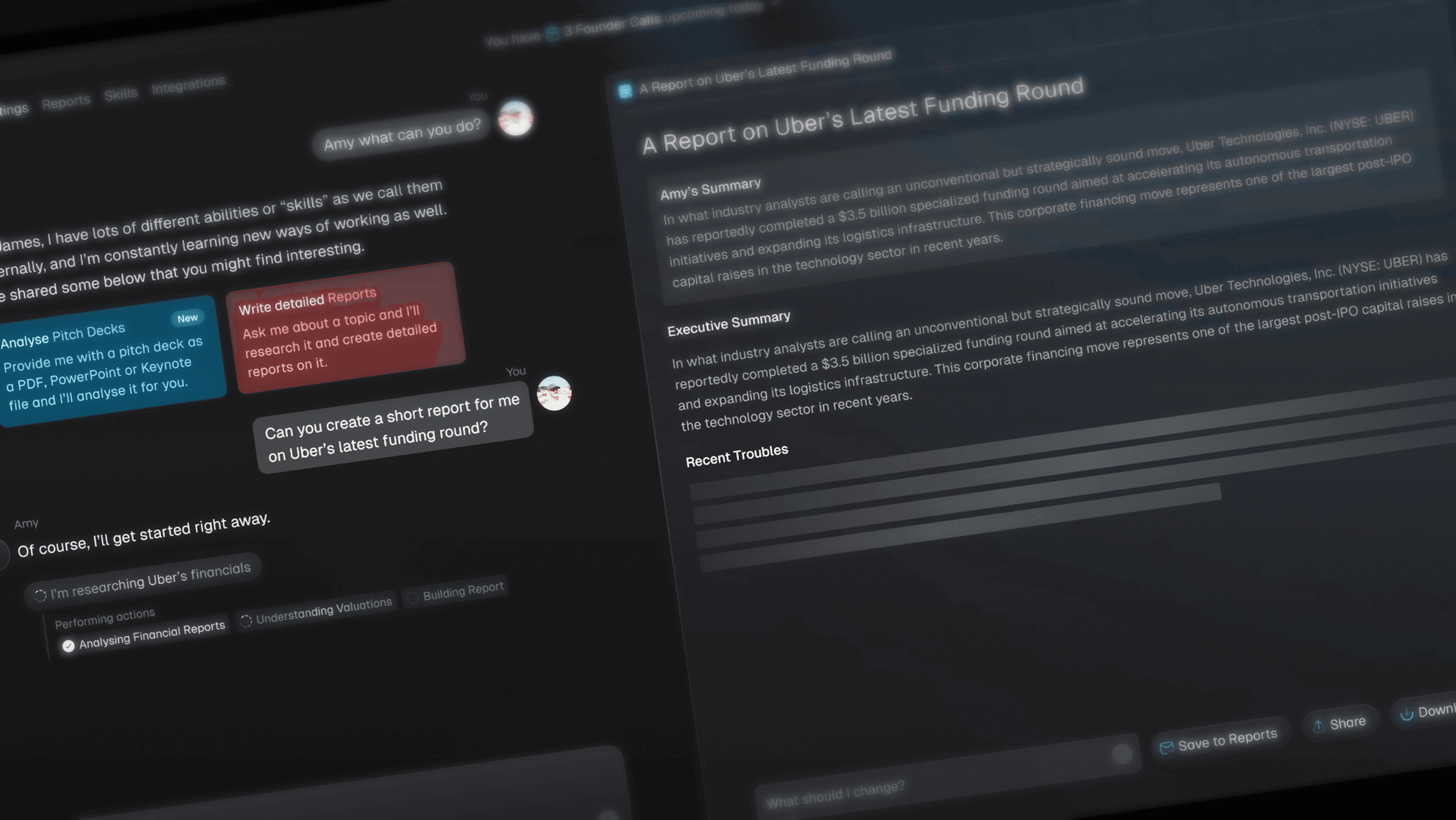 Amys skills and Actions combine to allow her to complete end-to-end workflows for your investment team